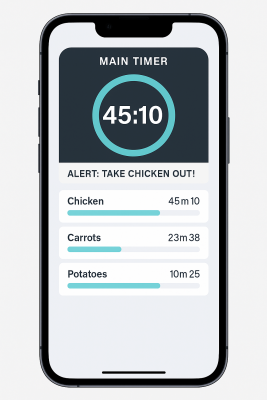 With Chef-Time, you can schedule every dish to be ready exactly when you want to serve. Just enter your dishes, set your desired serve time, and let the app calculate start times, track progress, and alert you when it’s time to cook — ensuring every course is hot, fresh, and perfectly timed.